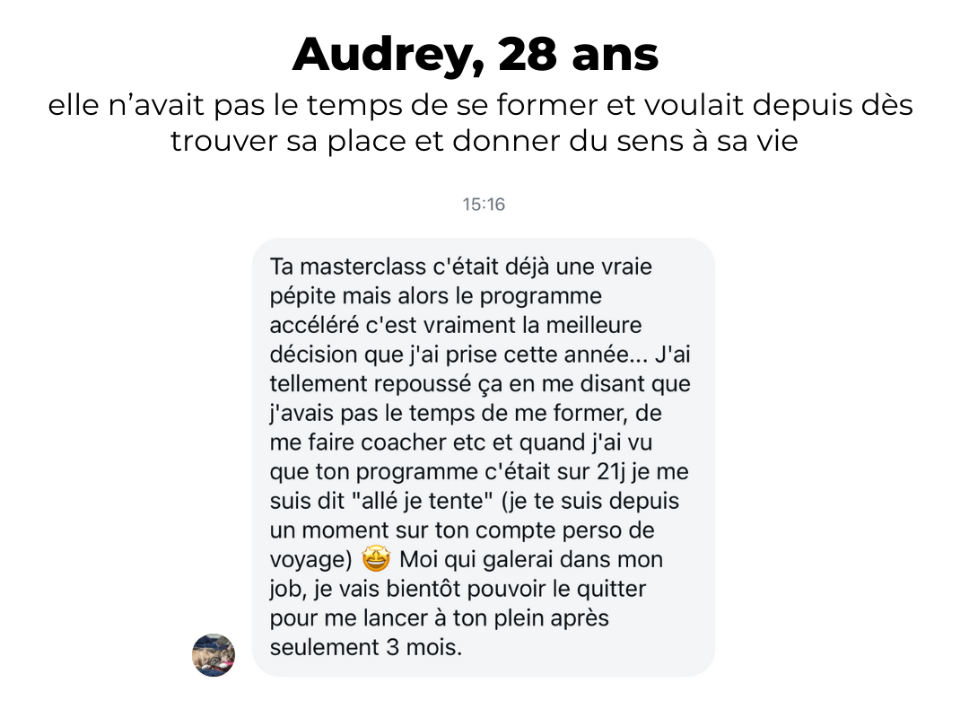 Tu n'es pas là pour écouter de la théorie et regarder des heures de vidéos ennuyantes, tu es là pour accéder à des raccourcis qui vont te faire gagner plusieurs années. J'ai créé cette méthodologie en m'appuyant sur ma propre expérience et celle de toutes les personnes que j'ai eu la chance d'accompagnement dans leur changement de vie.